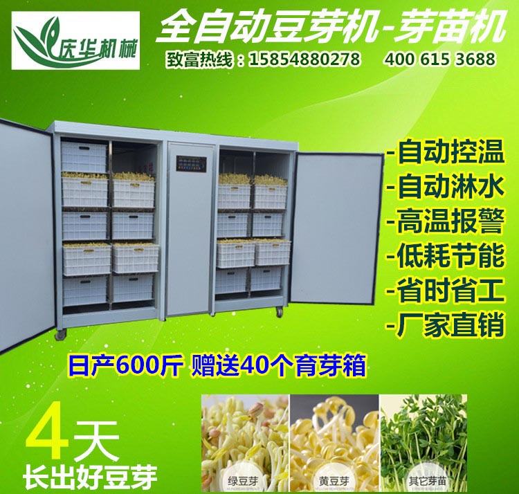 5、豆芽機(jī)產(chǎn)品特點(diǎn): 1)我公司生產(chǎn)的全自動(dòng)綠色無污染豆芽機(jī),是現(xiàn)代技術(shù)與傳統(tǒng)工藝的結(jié)合。豆芽機(jī)通過微電腦自動(dòng)控溫、自動(dòng)加溫、自動(dòng)顯示溫度、自動(dòng)淋水,實(shí)現(xiàn)了生產(chǎn)過程的全自動(dòng)化,具有省時(shí)、省工、低耗、無噪音等特點(diǎn)。 2)用我公司豆芽機(jī)生產(chǎn)的豆芽比傳統(tǒng)手工生產(chǎn)周期短質(zhì)量好,一般手工生產(chǎn)豆芽的周期,夏季需4-5天,冬季需要7-8天,而豆芽機(jī)生產(chǎn)豆芽只要3-4天即可,且不受地理環(huán)境、氣候條件和季節(jié)的影響。 3)我公司豆芽機(jī)生產(chǎn)的豆芽不僅種類多,而且產(chǎn)量高,一斤豆種可生產(chǎn)10斤左右的豆芽。且人工控制的環(huán)境下,豆芽生長(zhǎng)均勻一致,潔白鮮嫩、清脆多汁,口感清爽;不僅食用安全、營(yíng)養(yǎng)豐富,還具有一定的食療保健作用。 4)節(jié)省勞力,操作方便。將浸泡后的豆種放進(jìn)豆芽機(jī)育芽箱內(nèi),就不用管了,它會(huì)自動(dòng)加溫,自動(dòng)淋水,經(jīng)過3-4天時(shí)間就可生產(chǎn)出潔白脆嫩的豆芽。 5)減少爛芽現(xiàn)象。豆芽生長(zhǎng)的爛芽現(xiàn)象多發(fā)生在培育后的三天左右,由于手工生產(chǎn)豆芽的周期長(zhǎng),易出現(xiàn)爛芽現(xiàn)象,然而采用豆芽機(jī)生產(chǎn),三天左右豆芽已經(jīng)成熟,可以采收食用,不會(huì)有爛芽現(xiàn)象發(fā)生。