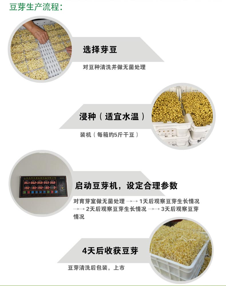 3.豆芽生產(chǎn)流程: 選擇芽豆 →→ 對豆種清洗并做無菌處理 →→ 浸種(適宜水溫) →→ 裝機(jī)(每箱約5斤干豆) →→ 啟動豆芽機(jī),設(shè)定合理參數(shù) →→ 對育芽室做無菌處理 →→ 1天后觀察豆芽生長情況 →→ 2天后觀察豆芽生長情況 →→ 3天后觀察豆芽情況 →→ 4天后收獲豆芽 →→ 豆芽清洗后包裝,上市。